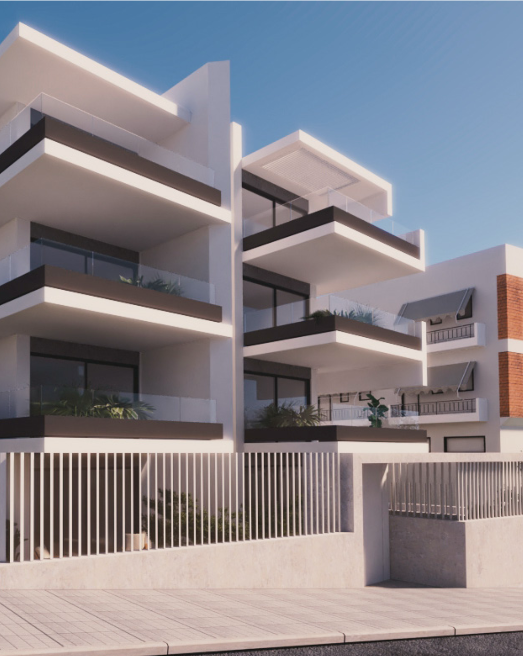 Η μελέτη περιλαμβάνει υπόγειες θέσεις στάθμευσης για όλα τα διαμερίσματα, αποθηκευτικούς χώρους και ιδιωτική χρήση κήπου και πισίνας στα διαμερίσματα του ισογείου